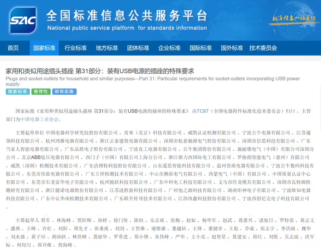 IT之家 5 月 18 日消息,國家市場監(jiān)督管理總局(國家標(biāo)準(zhǔn)化管理委員會)4 月 25 日批準(zhǔn)《家用和類似用途插頭插座 第 31 部分:裝有 USB 電源的插座的特殊要求》等 295 項(xiàng)推薦性國家標(biāo)準(zhǔn)和 2 項(xiàng)推薦性國家標(biāo)準(zhǔn)修改單。其中,USB 電源插座新規(guī)將在 2025 年 11 月 1 日實(shí)施。