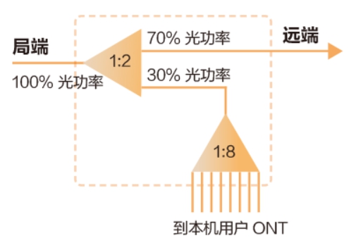 不等比分光器(如圖1)是把局端來的100%光功率信號(hào)進(jìn)行不等比例分光,70%的光功率輸出到遠(yuǎn)端,30%的光功率留用到本機(jī)用戶,再進(jìn)行等比例分光到本機(jī)用戶。雖然本機(jī)用戶僅留分了30%的光功率,但也能夠滿足本機(jī)用戶的需要。