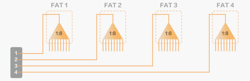 不等比例分光器的優(yōu)點(diǎn),是大大減少了分光器到局端的光纜總數(shù)量, 4個(gè)分光器之間,以及到局端方向,僅需一根單芯光纜即可。如果是等比例分光呢?就必須用4根光纖了(如圖3)。
