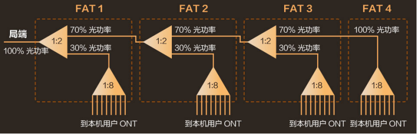通常,將多個(gè)這種不等比分光器進(jìn)行“級(jí)聯(lián)”,如4級(jí)“級(jí)聯(lián)”(如圖2),前三個(gè)都是不等比例分光,第四個(gè)分光器是等比例分光,即局端來的光功率100%留給了FAT4本機(jī)用戶。雖然第三個(gè)、第四個(gè)分光器的局端光功率絕對(duì)值相對(duì)較小,但是,也仍然能夠滿足其本機(jī)用戶的需要。