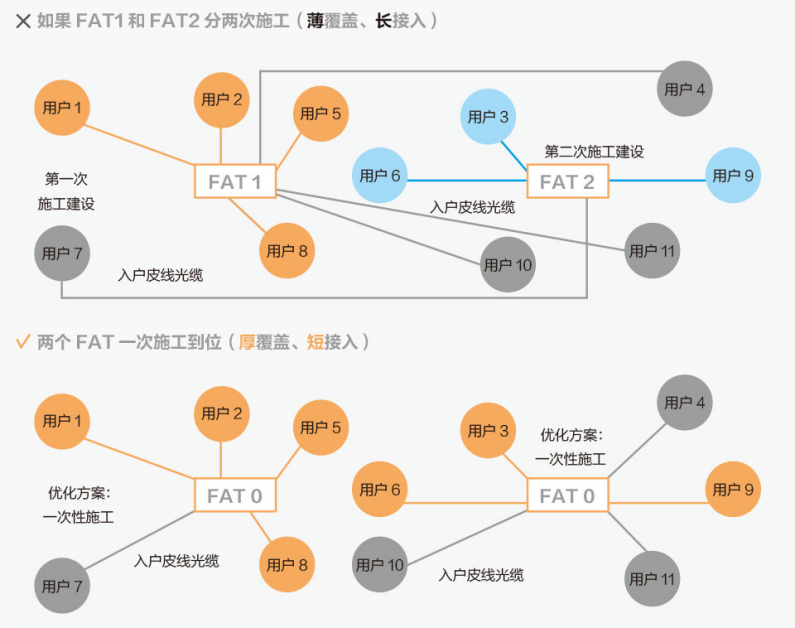 當(dāng)FAT1首先裝滿,沒有空閑端口了,在FAT1周邊的新用戶(如用戶7)無奈需要連接到FAT2。同樣,入戶安裝距離太長,大大增加了入戶裝機(jī)成本。
