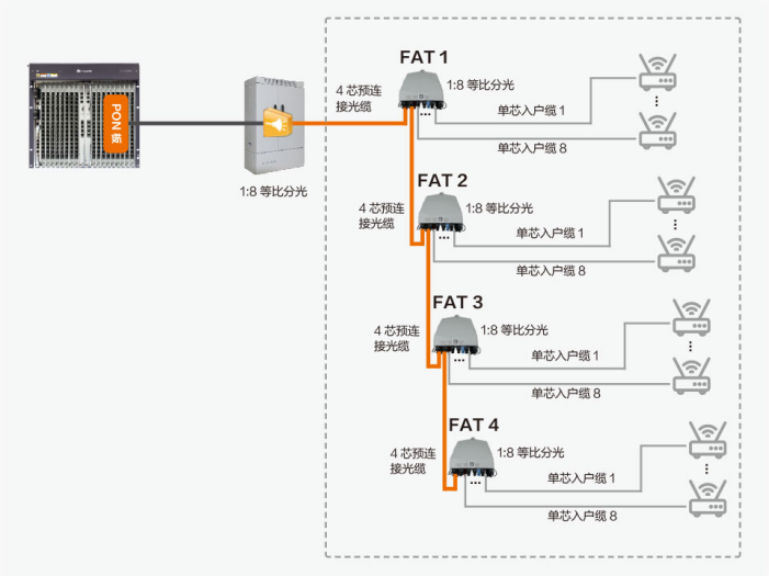 如果居民密度一般,通常選用8端口FAT,如果用戶密度非常小,也可選用4端口或2端口FAT。FAT至住戶平均接入距離通常在30~80米。
