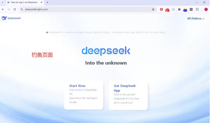 以釣魚(yú)網(wǎng)站“https://deepseeklogins.com/”為例,其頁(yè)面結(jié)構(gòu)和風(fēng)格與 DeepSeek 官方網(wǎng)站高度相似,旨在通過(guò)偽造官方頁(yè)面來(lái)誘導(dǎo)用戶泄露敏感信息。與真實(shí)網(wǎng)站相比,釣魚(yú)頁(yè)面移除了中英文切換的超鏈接。在該釣魚(yú)頁(yè)面中,點(diǎn)擊右上角的“API Platform”鏈接將會(huì)引導(dǎo)用戶跳轉(zhuǎn)到偽造的登錄頁(yè)面