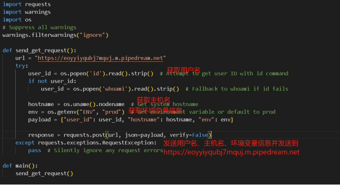代碼中 https://eoyyiyqubj7mquj.m.pipedream.net 是 Pipedream 平臺(tái)提供的 HTTP 端點(diǎn),可用于接收、存儲(chǔ)并處理傳入的數(shù)據(jù)。任何發(fā)送到該 URL 的信息都會(huì)被 Pipedream 記錄,并可能用于后續(xù)分析或進(jìn)一步操作。