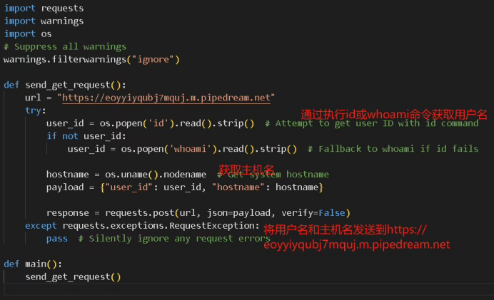 經(jīng)安全研究人員分析,deepseeek 軟件包的哈希值為 0bd29789ab155b95fbb11e44afc39b1fbb555bbbcacb210b03fed5a22e0fa03b,其文件名為 deepseeek-0.0.8-py2.py3-none-any.whl。該軟件包的主要功能是獲取執(zhí)行環(huán)境的用戶名和主機(jī)名,并將這些信息發(fā)送至 https://eoyyiyqubj7mquj.m.pipedream.net。